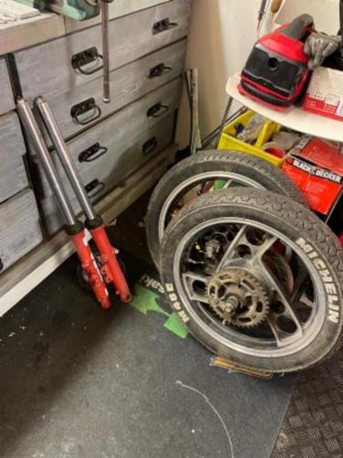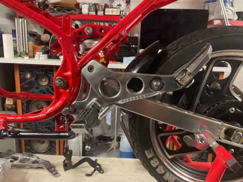 Gabel überholt, Lenkkopflager neu, Gabelstiefel poliert, Räder gereinigt und poliert, Aluschwinge und Öhlins Federbein eingebaut - schön langsam wirds