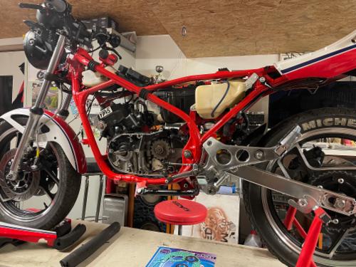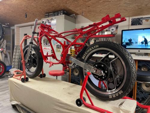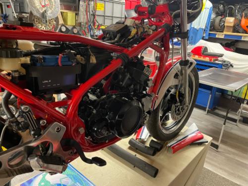 Gabel überholt, Lenkkopflager neu, Gabelstiefel poliert, Räder gereinigt und poliert, Aluschwinge und Öhlins Federbein eingebaut - schön langsam wirds